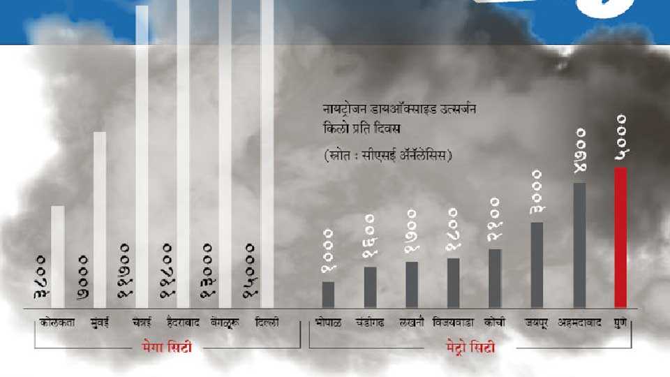 पुणे : मानवी आरोग्यासाठी अत्यंत घातक असलेल्या नायट्रोजन डायऑक्साइडच्या उत्सर्जनात देशातील मेट्रोसिटींमध्ये पुणे पहिल्या क्रमांकावर आहे. रस्त्यांवरून दिवस-रात्र धूर ओकत फिरणाऱ्या वाहनांमुळे शहरातील हवेत दर दिवशी सुमारे पाच हजार किलो नायट्रोजन डायऑक्साइड सोडला जात आहे. त्यामुळे पुणेकरांचा श्वास या विषारी वायूमध्ये गुदमरत आहे.